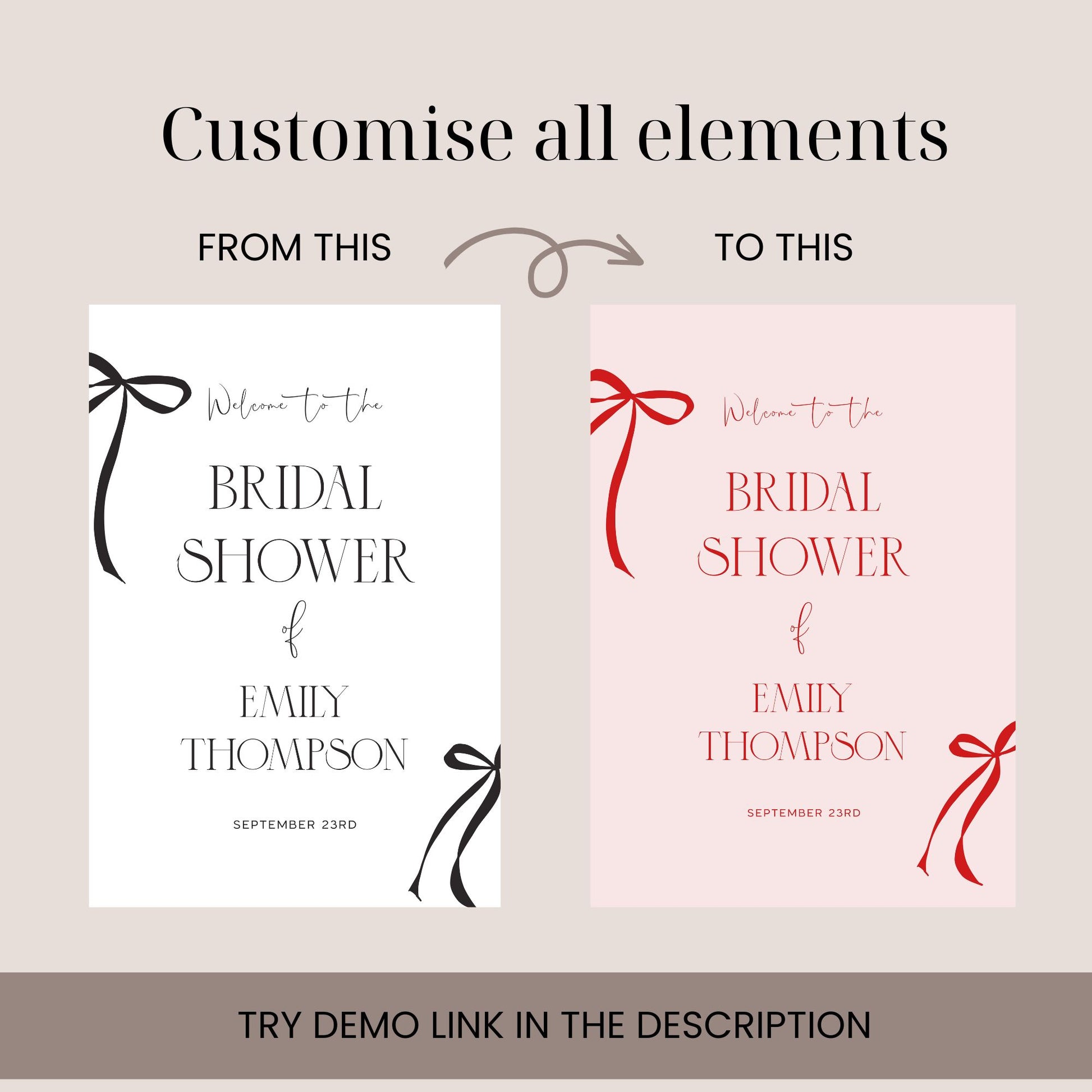 Welcome your guests in style with our modern Black Bow Bridal Shower Welcome sign! Perfect for your special event, this customizable bridal shower decor features my original hand-drawn bow illustrations and modern serif typography, making it an eye-catching addition to your celebration. As she’s tying the knot, this bridal welcome sign will greet your friends and family and set the perfect tone for a joyful gathering. Available as an instant access, you can easily personalize it to suit your taste and preferences. From an elegant wedding shower sign to a fun bridal shower sign, this editable template is the ideal choice to enhance your special day. Don’t miss out on creating memorable moments with this delightful pink bow bridal sign!