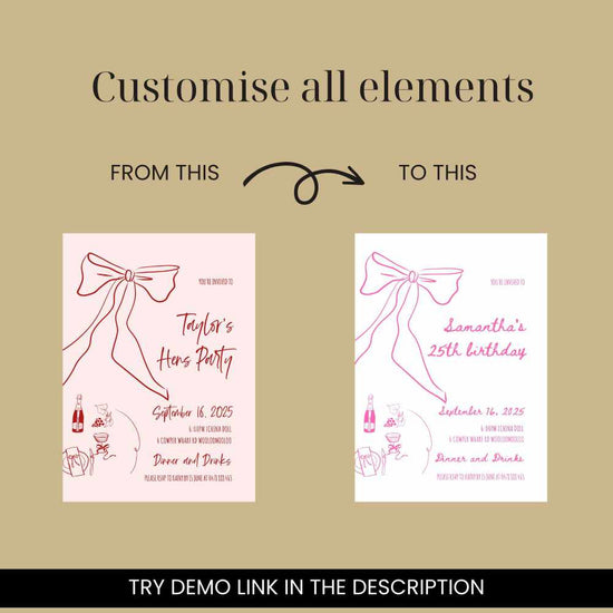 This hand-drawn Bow Hen's Party/Bachelorette Party Invitation Template features our original bow, dinner setting, drink, and illustrations with handwritten typography. Whether you have a hen's party, birthday, bridal shower, or any special celebration, this design will add a special touch to your event.