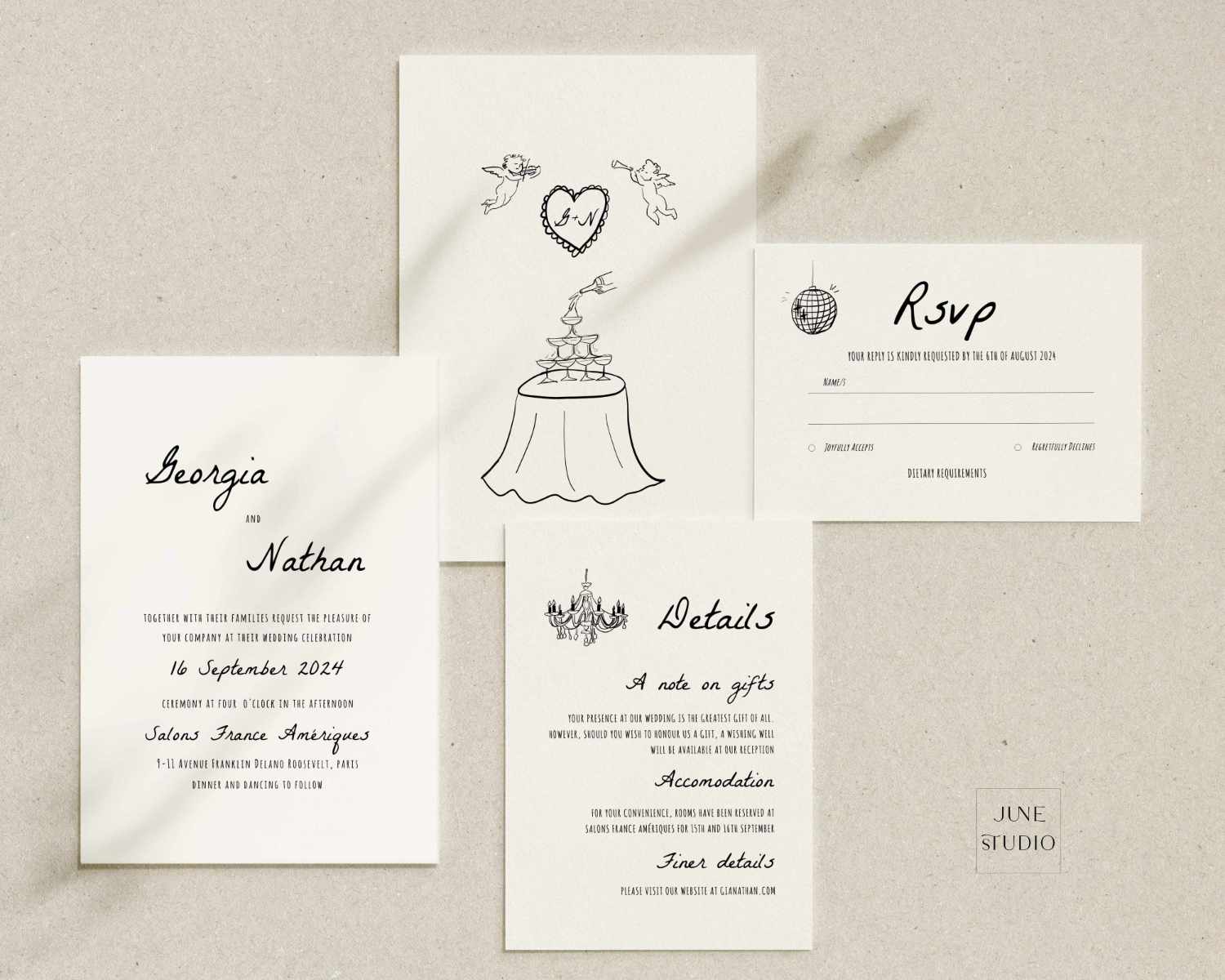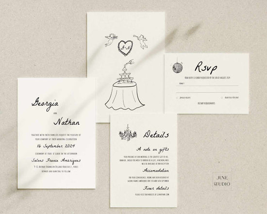 The listing is for The hand-drawn Wedding Invitation Suite Template in the Audrey Collection. This design features our original illustrations inspired by modern vintage style and handwritten typography. Adorning the suite with cute cupids, chandelier and whimsical champagne tower, we've created an enchanting design that captures the essence of timeless love, making your wedding invitations truly unique.