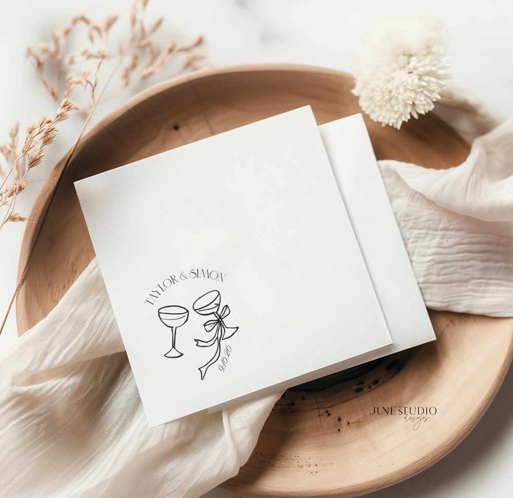Introducing our hand-drawn Champagne Glass Cocktail Napkin Digital Template in the Old Money Eleanor collection. This design features our whimsical illustration and modern vintage-inspired typography. This template is fully editable and perfect for making custom cocktail napkins for your wedding, engagement party, couple shower, or any special event.