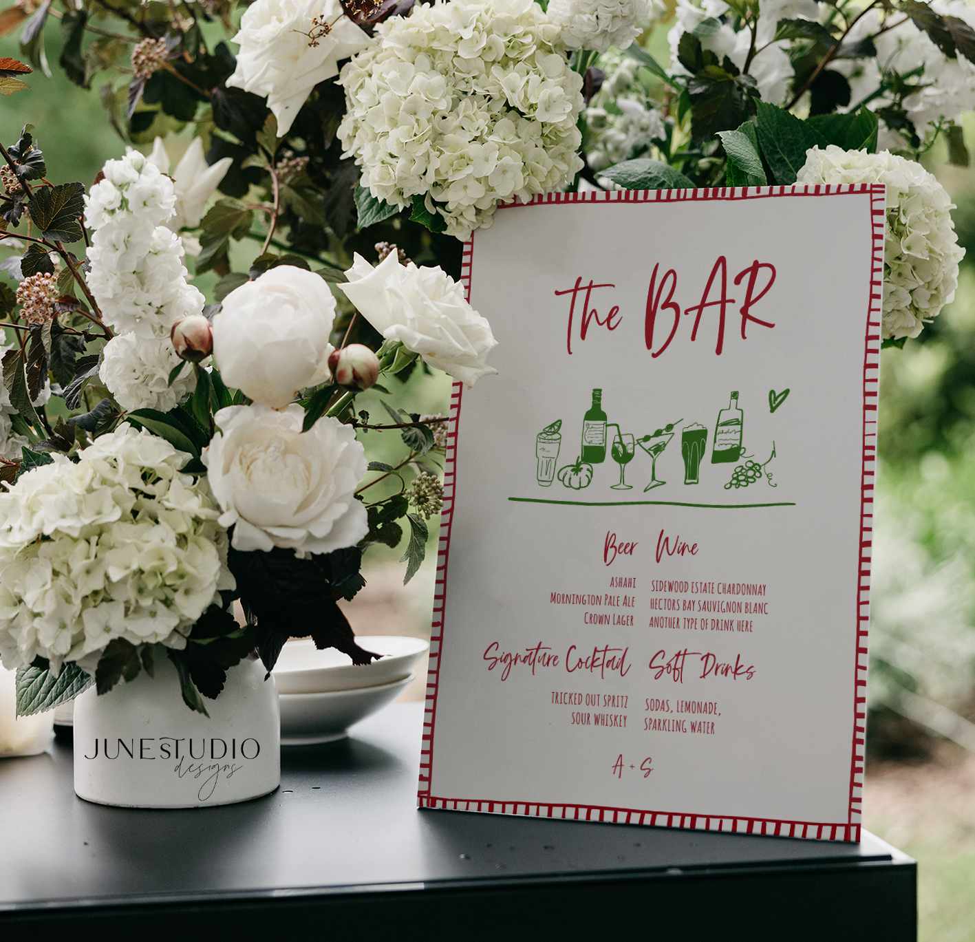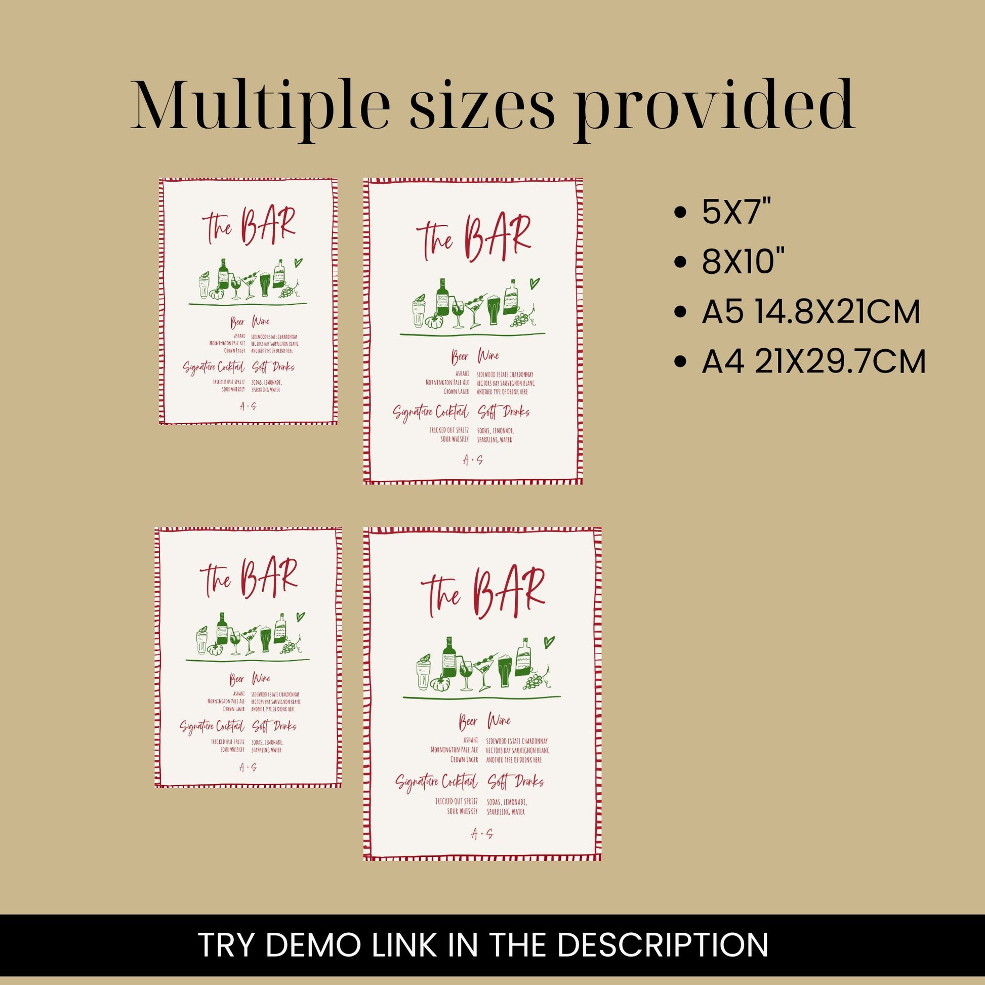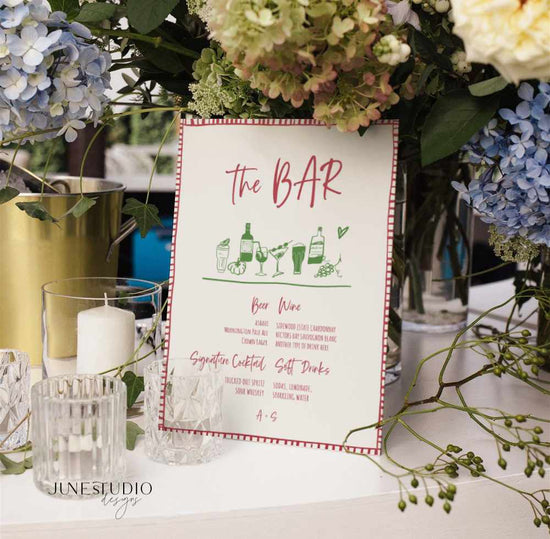 Introducing our Wedding Bar/ Drinks Menu Signage Template in That's Amore Chiara Collection. This design features my original hand-drawn illustrations and hand-written typography, making it a unique addition to your wedding, engagement, hen's party, birthday, dinner party, or any special event. With this template, you will have access to our drinks illustrations and be able to edit all details, including wording, font, illustration color, and background color, and upload your own image/ illustration to make this design uniquely yours.