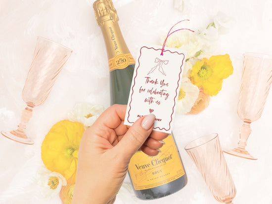 This listing is for the Modern Hand-Drawn Bow Favour Tag Template in the CHIARA Collection. This design featua res trendy bow illustratia on, wavy border, and handwritten typogr. It would bephy, a great addition to your engagement party, wedding, hen's party, bridal shower, rehearsal dinner, or any special event.