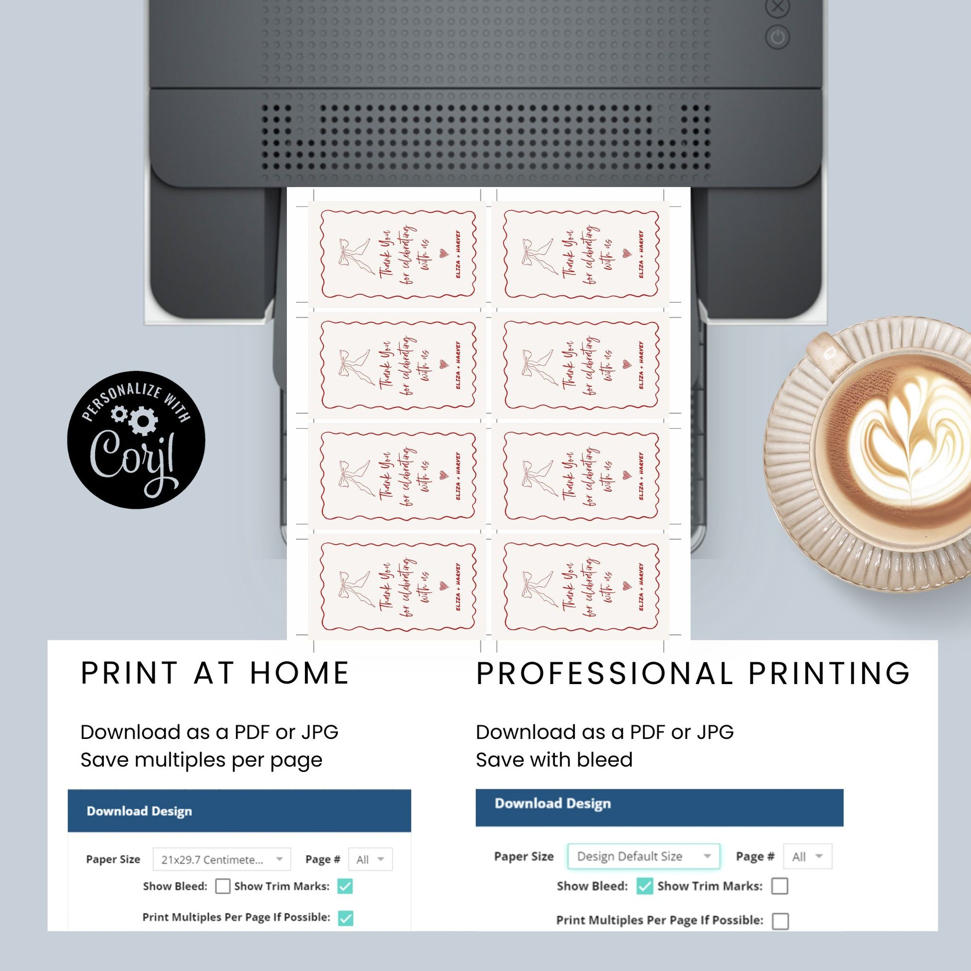 2. Make all desired changes to your template, save, and download your file as a PDF or JPG. You also have options to add bleed, crop marks, and have multiple copies per page to save paper.
