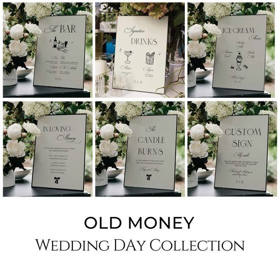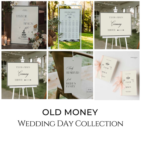 Introducing our Old Money Premium Wedding Day Bundle, a curated collection of 22 vintage-inspired stationery and signage that exude timeless elegance and sophistication. This exquisite design features hand-drawn illustrations of a champagne tower, a classic vintage cake, and delicate bows, all complemented by modern vintage typography. This collection is perfect for couples seeking to infuse their celebration with the charm and grace of a bygone era; our bundle adds a touch of luxury to your special day.