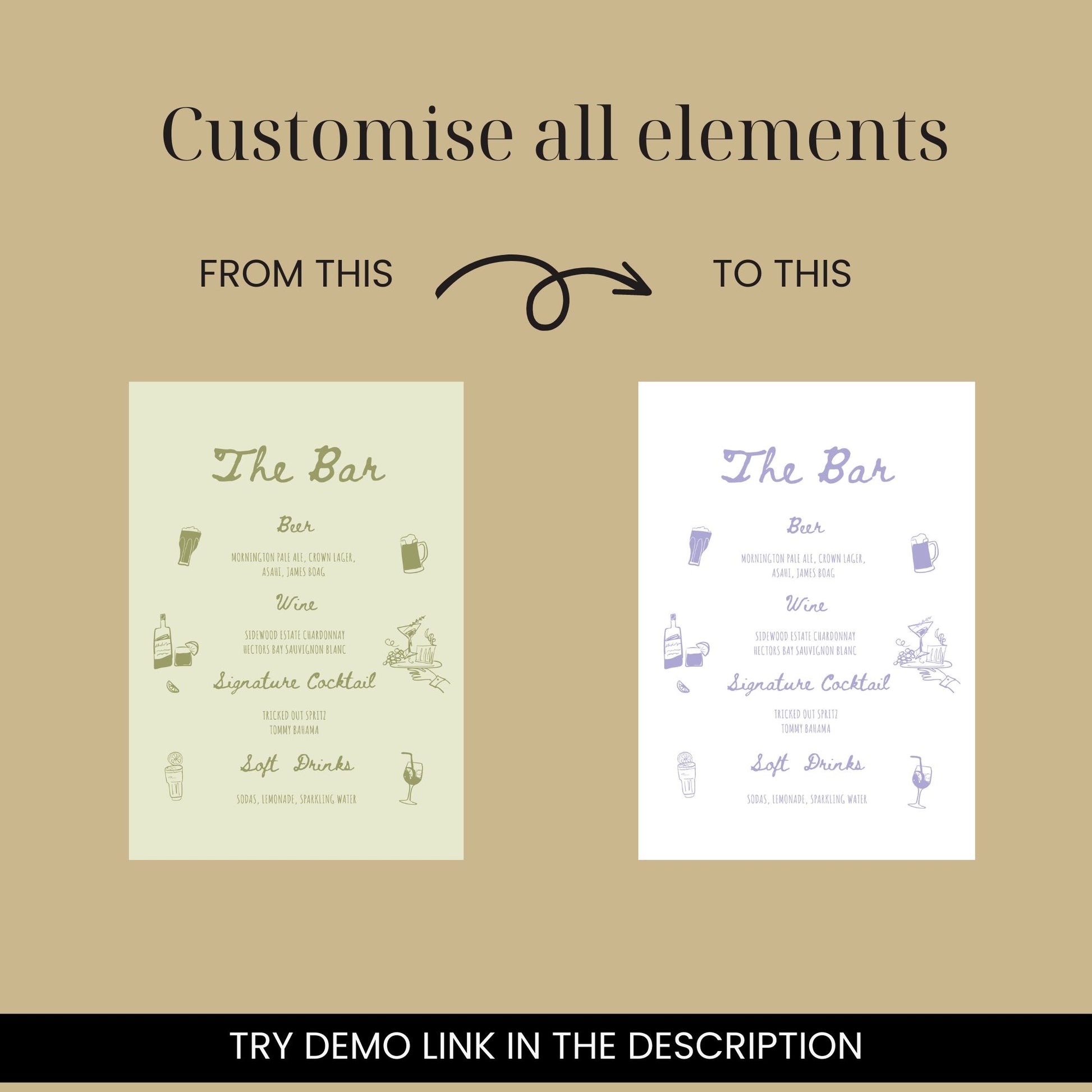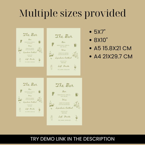 Introducing our hand-drawn Wedding Bar + Drinks Menu Sign Template in the Cheryl Collection. This design features my hand-drawn illustrations and handwritten typography, making it a unique addition to your wedding, engagement, hens party, birthday, dinner party, or any special event.